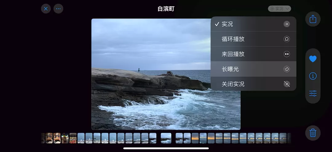 这时,实况照片的另一个隐藏功能就非常实用了。我们可以直接到相册中打开这张实况照片。然后找到照片右上角的“实况”小图标,点击它你会发现目前选中的是“实况”,你只要把它改成“长曝光”,这张照片就会被iOS自动调整成长曝照片。
