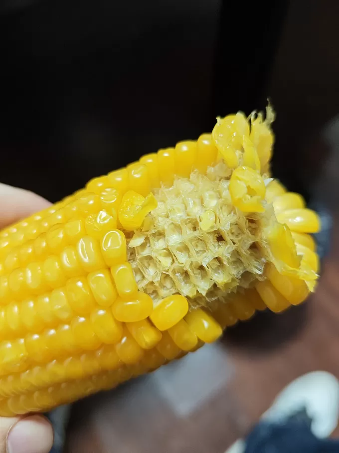 第一次吃到这么难吃的玉米。每一口下去,玉米都很硬。一点也不黏,也不甜。嚼起来就像很老的玉米。外包装纸盒说生产日期是十一月十一号。我看就是去年或者上半年生产的玉米。都老掉牙了!干巴巴的难吃,没有一点玉米味。蒸了二十分钟。最后吃了几口丢垃圾桶了!总感觉有一点怪味。反正是不新鲜。问客服,就说核实过了。产品没问题。这个有大问题,11.10买的,11.11外面纸盒包装生产日期。里面玉米密封袋没有写生产日期。也不知道啥时候密封的。外面包装有一层灰,不知道囤多久了。只能说玉米是足够分量。就是难吃不新鲜不好吃。外包装盒子有一点臭。是回收材料?