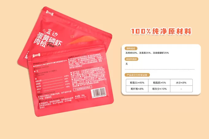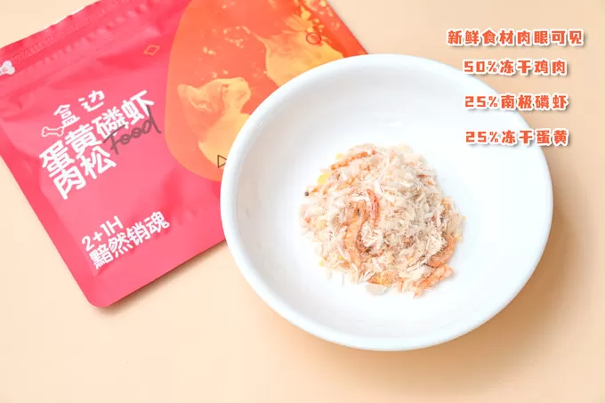 恰好双十一看到了〈b〉盒边蛋黄磷虾鸡肉松,10袋30g装仅需29元,性价比非常高。细看配料表也干净,仅三种成分:〈b〉冻鸡肉50%、冻蛋黄25%、冻南极磷虾25%,经过FD航空级营养留存技术冻干而成,无任何添加剂诱食剂。