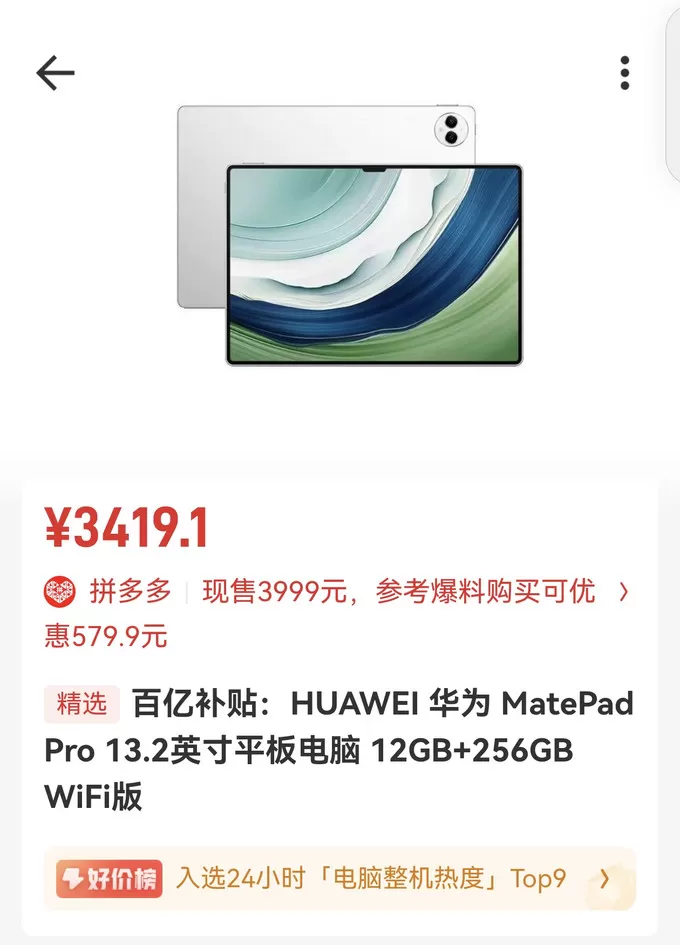 官旗的售价其实并未松动多少,但在大妈站内咱看到了那个让我惊诧不已的售价:3419!这个价格就连标准版的数字系列手机都买不到了但你却可以买到华为尺寸最大的平板!怎么华为也玩起性价比来了