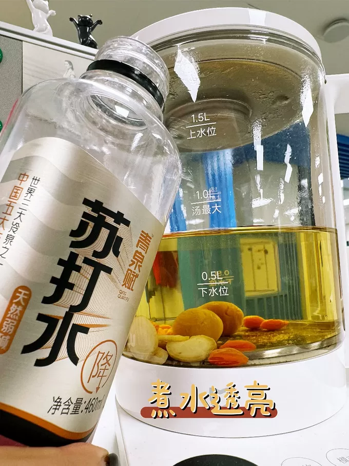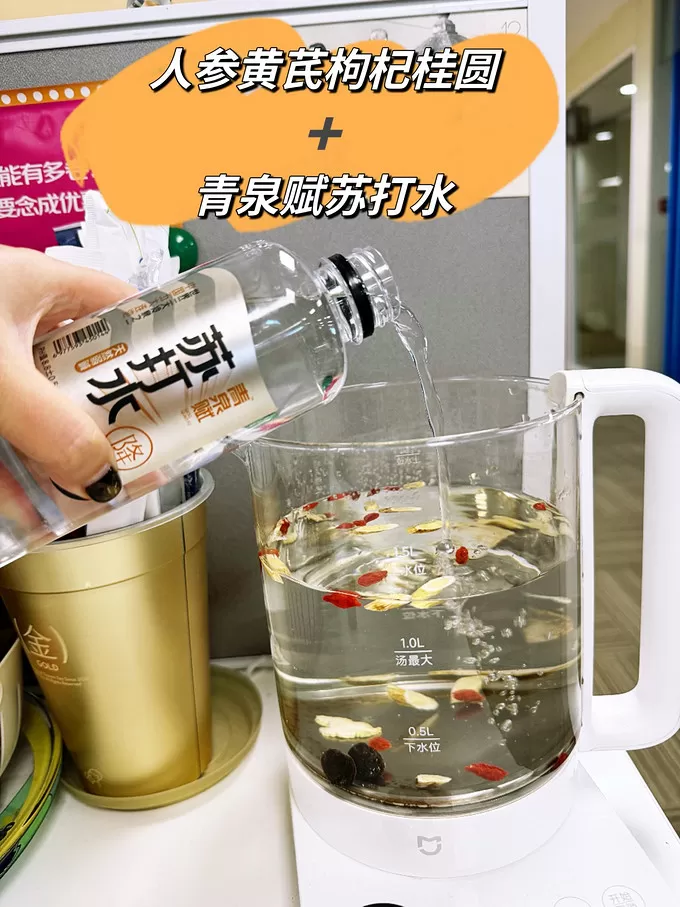 3瓶青泉赋+黄芪+人身+枸杞+桂圆,养生壶煮1.5小时,清爽补气,别提多健康了。