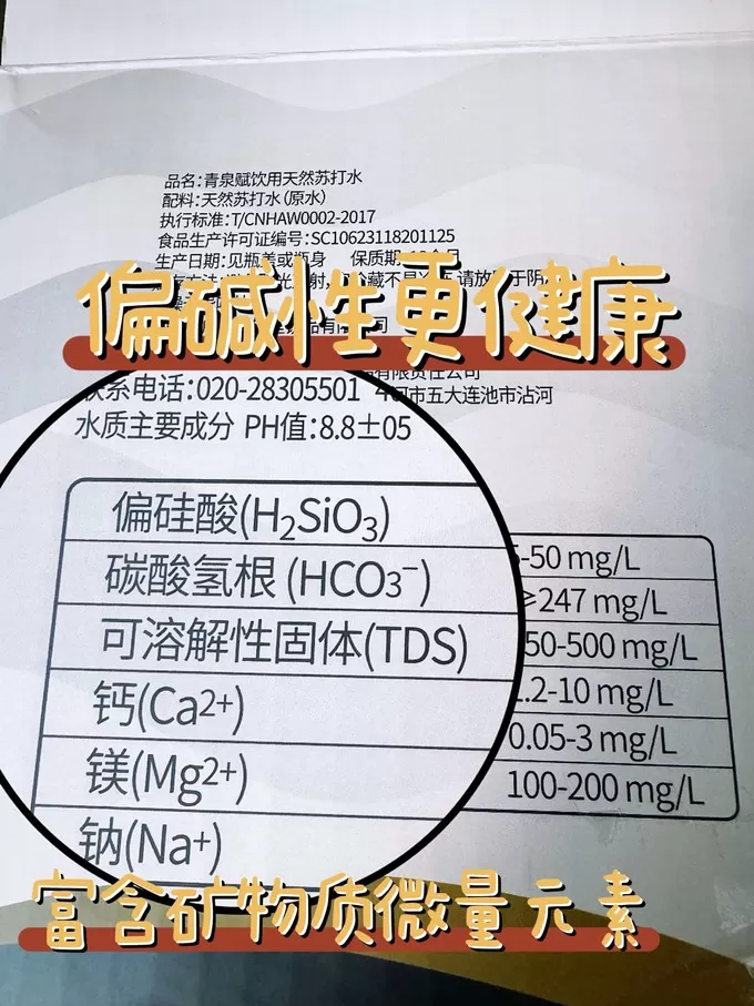 可以明显看到天然苏打水无人工添加,但是因为它来自万年形成的形成深层地下水,所以富含多种矿物质和微量元素,水质碱性PH值能达到8.5-9.2之间,呈现弱碱性。