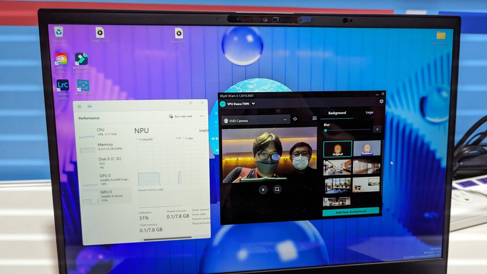展示了使用该款笔记本执行XSplit视频软件的情况,其中使用NPU来执行任务,比起完全依赖CPU执行,可以有效降低CPU工作负载,从2成降到1成多。