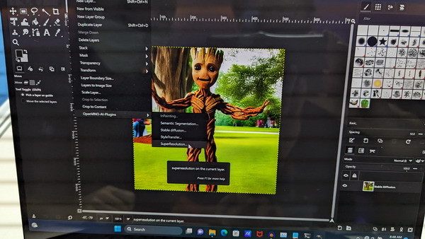 其中,华硕展示两项笔记本上的生成式AI相关应用,其中一项是文生图应用,他们在笔记本上安装了开源绘图工具GIMP,并使用OpenVINO的AI插件为其加入了Stable Diffusion文生图的功能。 用户只需输入文字,就可以在编辑界面中自动生成符合文字叙述的场景和人物图像,例如输入「格鲁特在公园跳舞」的英文字 就可以生成相对应的图像。 此外,用生成式AI产出的图片还可以通过另一个AI模型将图片放大4倍。