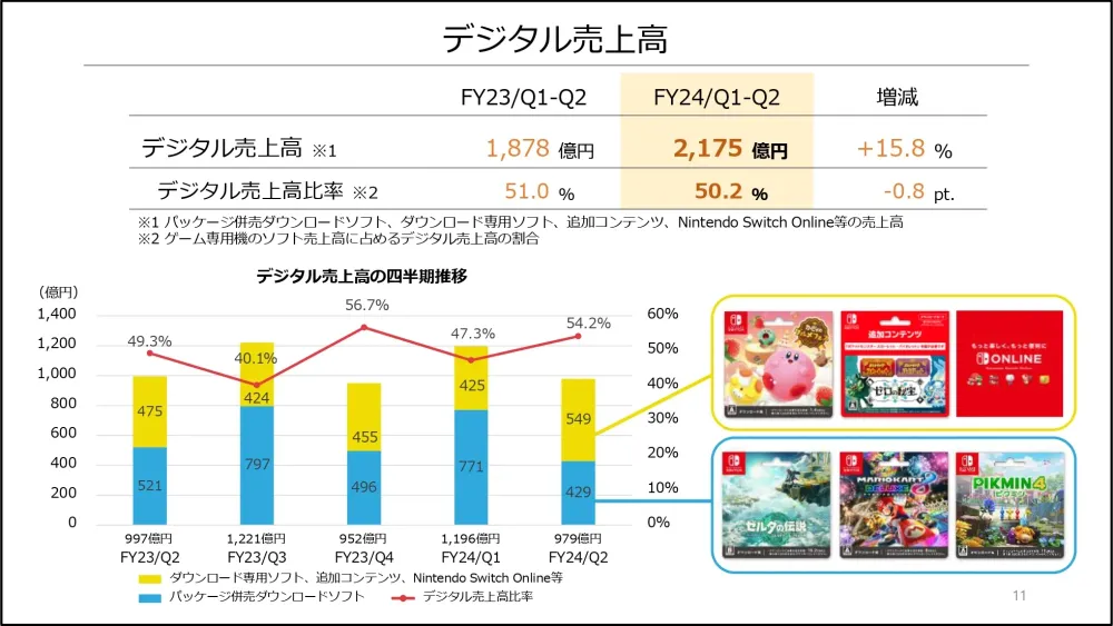 Nintendo Switch 的数字销售营业额为 2175 亿日圆,较前一年同期增加 15.8%,销售占比 50.2%。