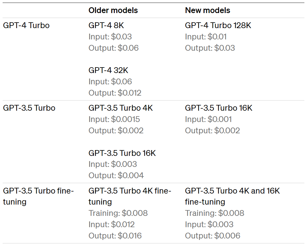 同样地,GPT-3.5 Turbo 16K 以及 GPT-3.5 Turbo 4K、16K 微调的价格也都有一定程度的下降,具体参见下图。