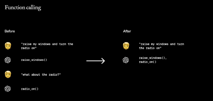 今天,GPT-4 Turbo 在这方面做了几项改进,例如在一条消息中能够呼叫多个函数。 用户可以在发送一条消息时请求多个操作,如「打开车窗并关闭空调」。 此外函数呼叫的准确性也得到提升,GPT-4 Turbo 更有可能返回正确的函数参数。