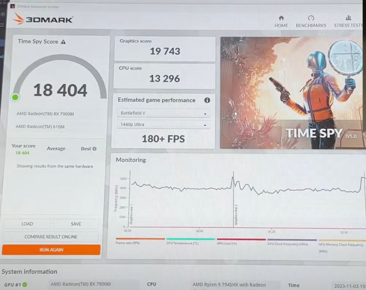 戴尔所推出的 外星人M18 笔记本上就是搭配 RX 7900M 移动版,CPU 的部分也用上了 Ryzen 9 7945HX。 最近已有测试曝光,在 3DMark Time Spy 的测试项目下,获得了18404分,图形分数19743,相比 RTX 4080 移动版图形分数18923,要高出了 4.3% 左右。