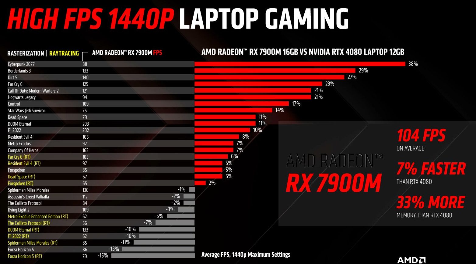 另外在AMD官方也放出了与RX 7900M与RX 4080移动版相比的效能差异,在1440p分辨率下,数款游戏RX 7900M的平均张为104FPS,相比RTX 4080平均要快7%,而且内存是高出了33%(16GB vs12GB)。