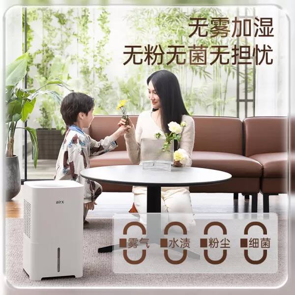Airx H8无雾加湿器采用了自然冷蒸发技术,无水雾无细菌,为您带来纯净的加湿效果。它还具有50度恒湿功能,通过高精度湿度传感器实时检测室内湿度,自动调节加湿量,使房间恒定50%湿度。此外,Airx H8还搭载了300万负离子浓度,搭配持续释放的负离子,如漫步森林般享受滋润舒适。每小时800ml的大加湿量让您迅速提升室内湿度,无需等待。360°循环加湿设计使得空气更加均匀湿润。6L大水箱一天只加一次水即可满足全天的加湿需求。全水路五重抑菌技术使得整机抑菌率高达99.26%,保证水质的安全和健康。同时,32dB的轻音运行让您在安静的环境下享受舒适的加湿效果。智能管家功能可通过airx智能APP自定义舒适的空气湿度,随心设置湿度实时数显。