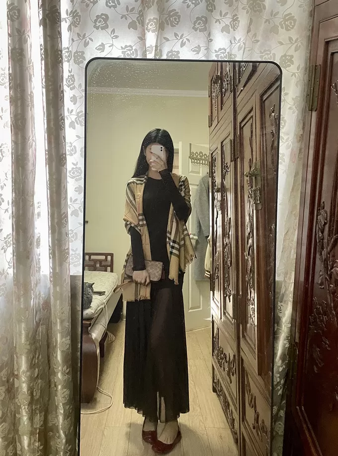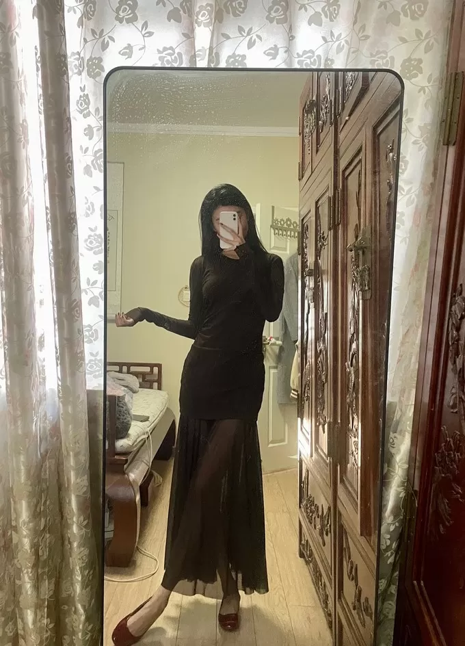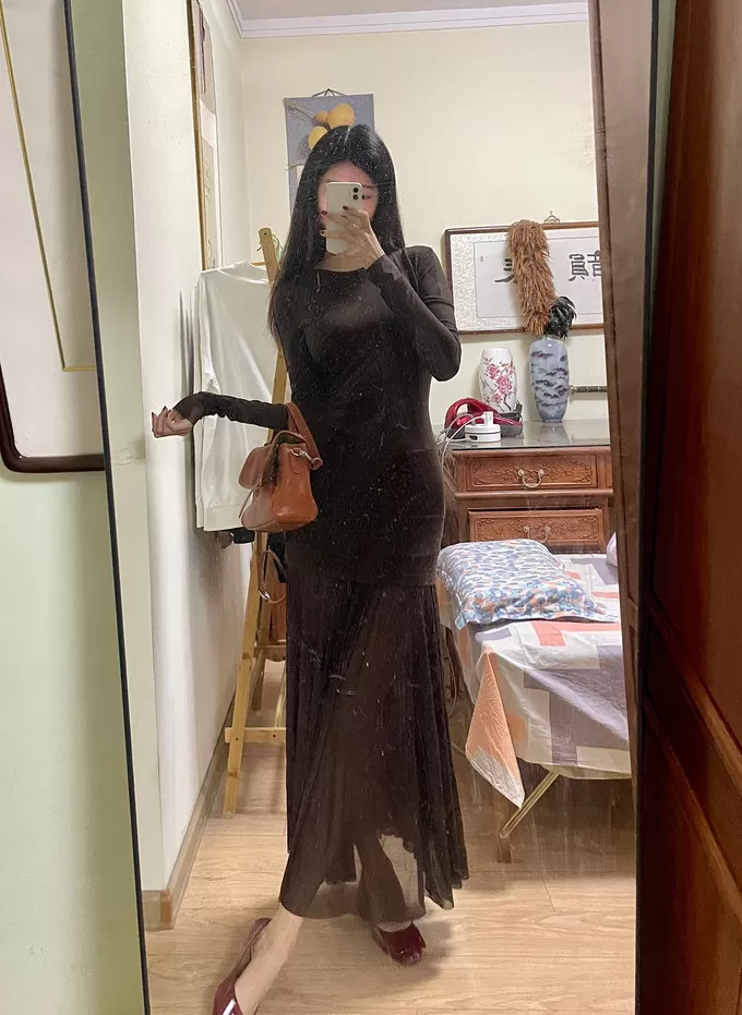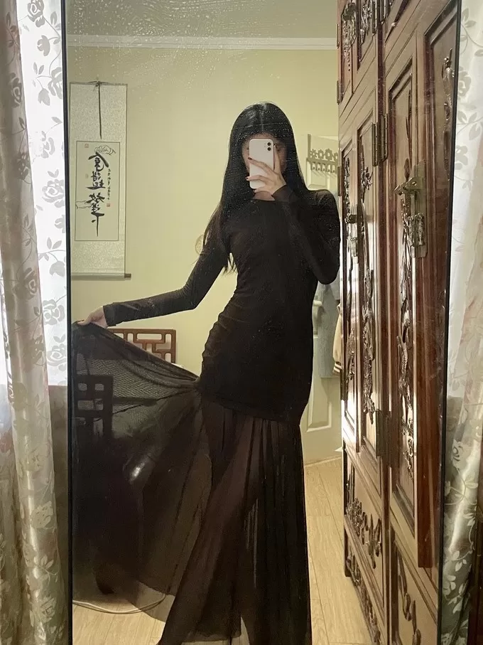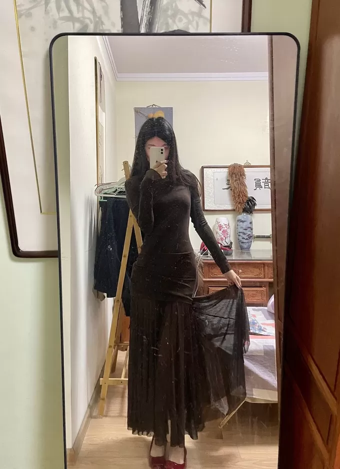 整体采用拼接假两件的设计!腰部抽褶拼接网纱裙摆裙裙摆延伸至脚踝飘逸灵动(很仙)带有轻微透肤感!有点小小的性感,但完全不俗气~很推荐~明年开春也可以穿🧚🏻♀️