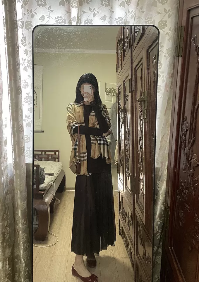 因为整体都是棕色系 ,可以选择一点小亮色打破沉闷色块!比如我选择一条Burberry披肩,既可爱又有气质!