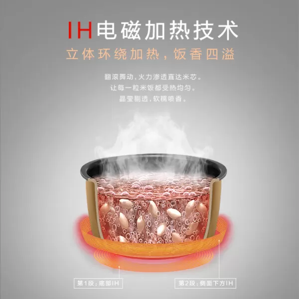 - IH电磁加热技术:这种技术能够立体环绕加热,确保每一粒米饭都能被均匀加热,饭香四溢,翻滚舞动,火力渗透直达米芯。