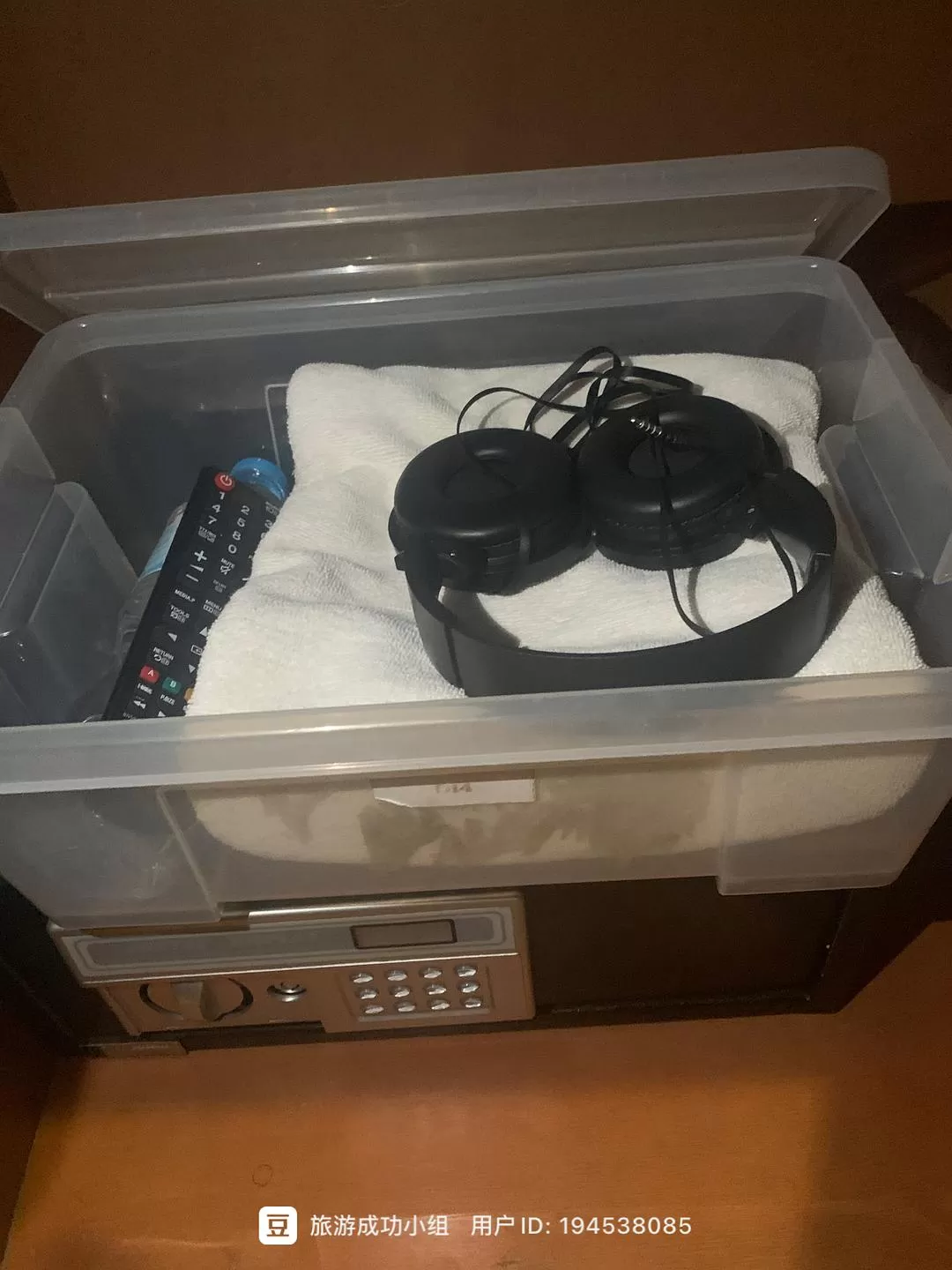 里面准备的东西,耳机、遥控器、浴巾和一瓶水。