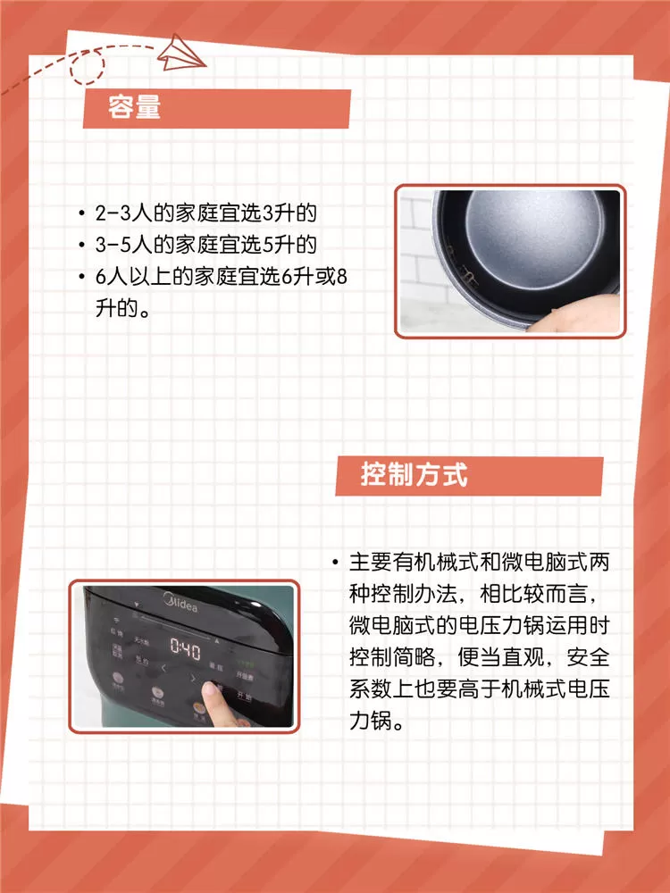 1、容量2-3人的家庭宜选3升的,3-5人的家庭宜选5升的,6人以上的家庭宜选6升或8升的。