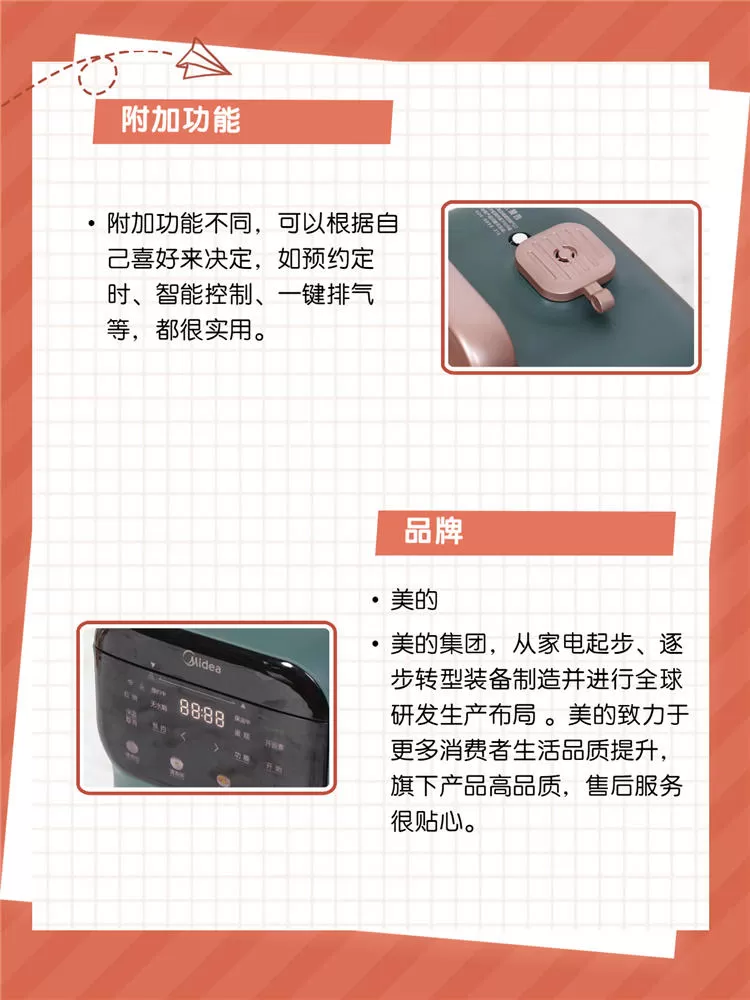 3、附加功能附加功能不同,可以根据自己喜好来决定,如预约定时、智能控制、一键排气等,都很实用。