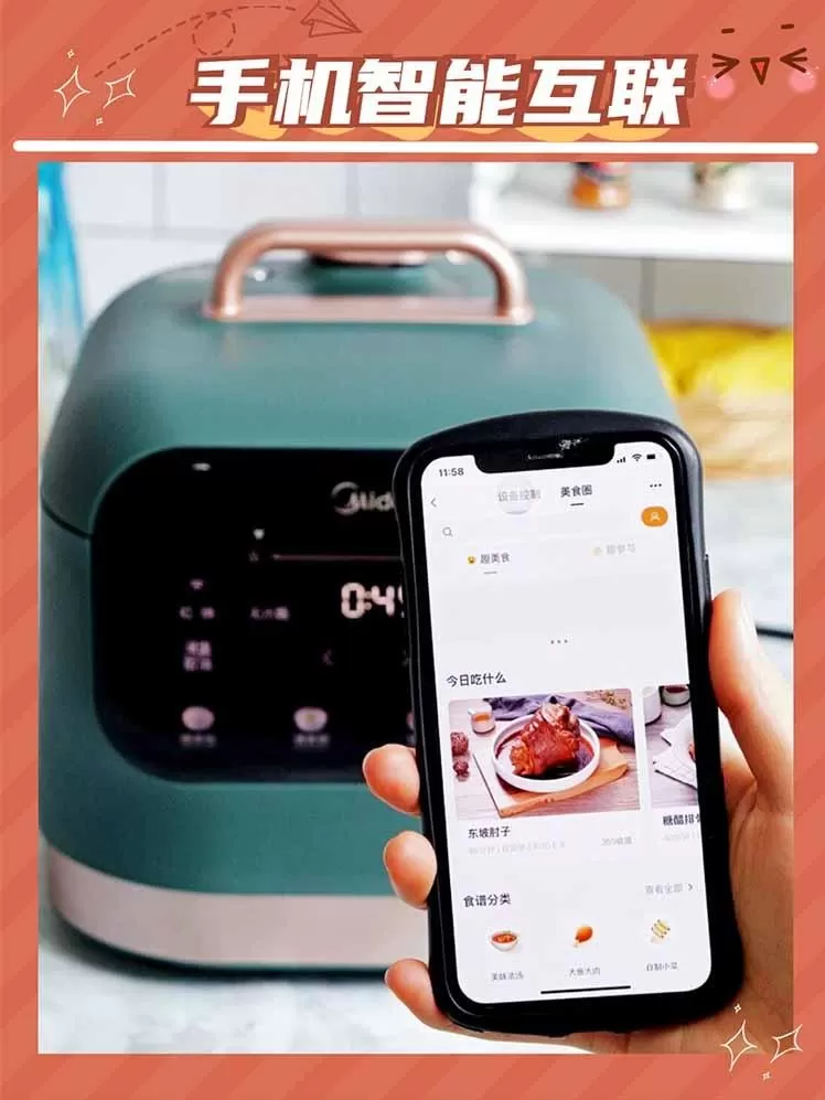美的迷你电压力锅MY-YL30M5-711具有70kpa高压快煮,能让热量穿透食材内部,激发食材营养,软化食材筋骨,还有开盖收汁能功能可以解锁,非常实用。连接智能APP,更是可以解锁海量食谱,丰富每一餐。