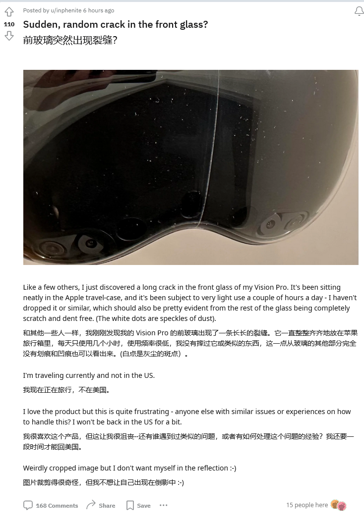 根据 Reddit 社区的帖子内容,这个裂痕主要出现在头显鼻梁处的中部位置,受影响严重的裂纹已经延伸到整个 Vision Pro 头显前置玻璃。