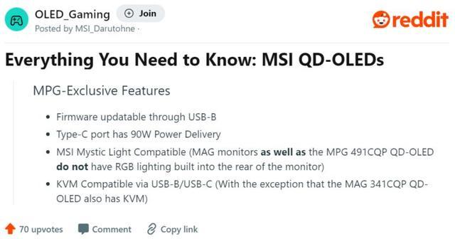 微星的 Reddit 账户“MSI_Darutohne”现身高端游戏显示器板块 r / OLED_Gaming,表示:“我们的 QD-OLED 显示器终于上市了,我们希望澄清任何误解,并确保这里的每个人都能在知情的情况下进行购买!让我们从六款全新 QD-OLED 显示器开始。”