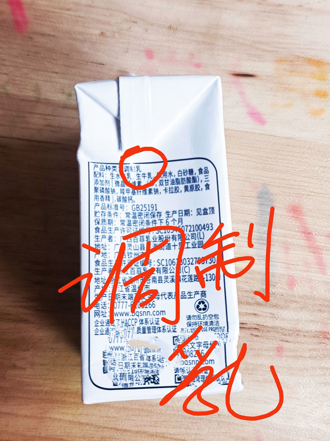 结果没曾想,买回来喝起来发甜。正面就写的是水牛高奶。结果产品名称那里,仔细一看那一行小字叫做:调制乳