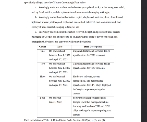 大哥叫丁林葳,今年38。他曾经在谷歌当过两年的工程师(2019年5月至2024年1月)。然后自从2022年6月1日开始,到了2023年4月17日,这哥们就搞出大事来了——他竟然从谷歌那儿偷出了超过500份的机密档案,特别是关于人工智能的那些。这些档案主要分四个部分。有的是关于TPU4芯片的结构和软件设计规则的;又有的是讲TPU6芯片的结构和软件设计规则的;再有些就是谷歌超级电脑数据中心用来处理TPU和GPU芯片学习任务的谷歌CMS软件设计规则。其中最牛的还得说是那个用来管理谷歌超级电脑数据中心那些TPU和GPU芯片学习任务的谷歌CMS软件设计规则。