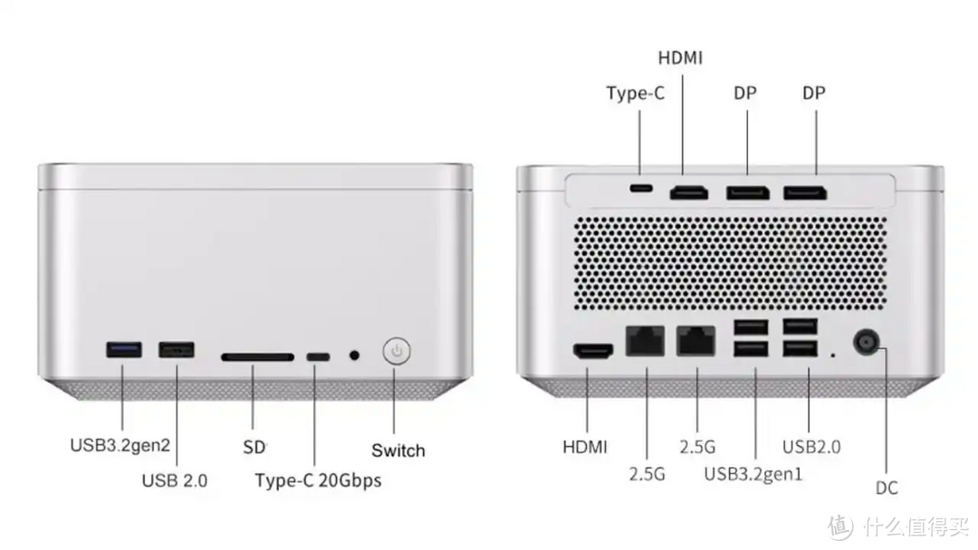 除了基本的接口配置,SZBOX FN60G迷你电脑还提供了丰富的扩展接口,包括 3 个USB 2.0、两个USB 3.2 Gen1、一个USB 3.2 Gen2、一个满血的 USB-C 20 Gbps 接口,以及 3.5mm 耳机孔、SD 读卡器和一个HDMI 2.0接口。这些接口能够满足用户在日常使用中的各种连接需求。