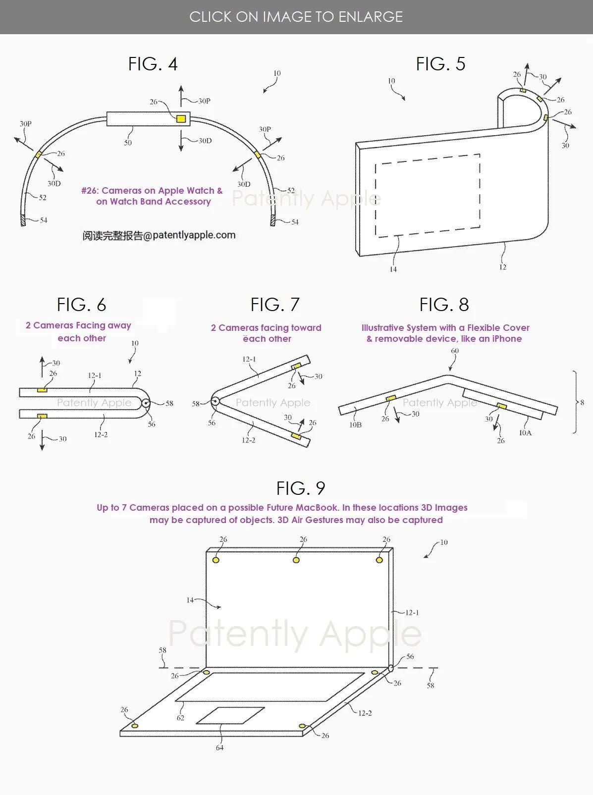 苹果还表示可以在 Apple Watch(图 4)以及柔性设备(图 5)上装备摄像头,用于录制 3D 图像、视频和空中手势,IT之家附上设计草图如下: