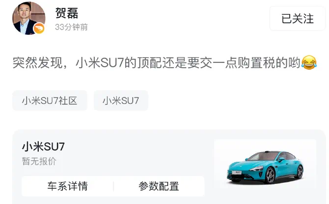 不久前,新出行CEO,前太平洋汽车网总编辑贺磊在新出行小米汽车社区爆料:“突然发现,小米SU7的顶配还是要 交一点购置税的哟。”