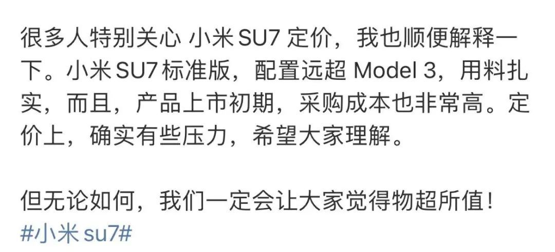 在提到了小米汽车的定价问题时,他表示,很多人特别关心小米SU7定价,顺便解释一下, 小米SU7标准版配置远超Model 3,用料扎实,而且产品上市初期,采购成本也非常高。“ 定价上,确实有些压力,希望大家理解。但无论如何,一定会让大家觉得物超所值!”