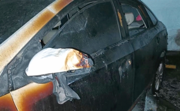 由于火势较大,事故车附近还有7辆车受到不同程度的波及,最近的一辆白色别克车已经被烤成焦炭色,后视镜烤化、车窗崩碎、门把手脱落。