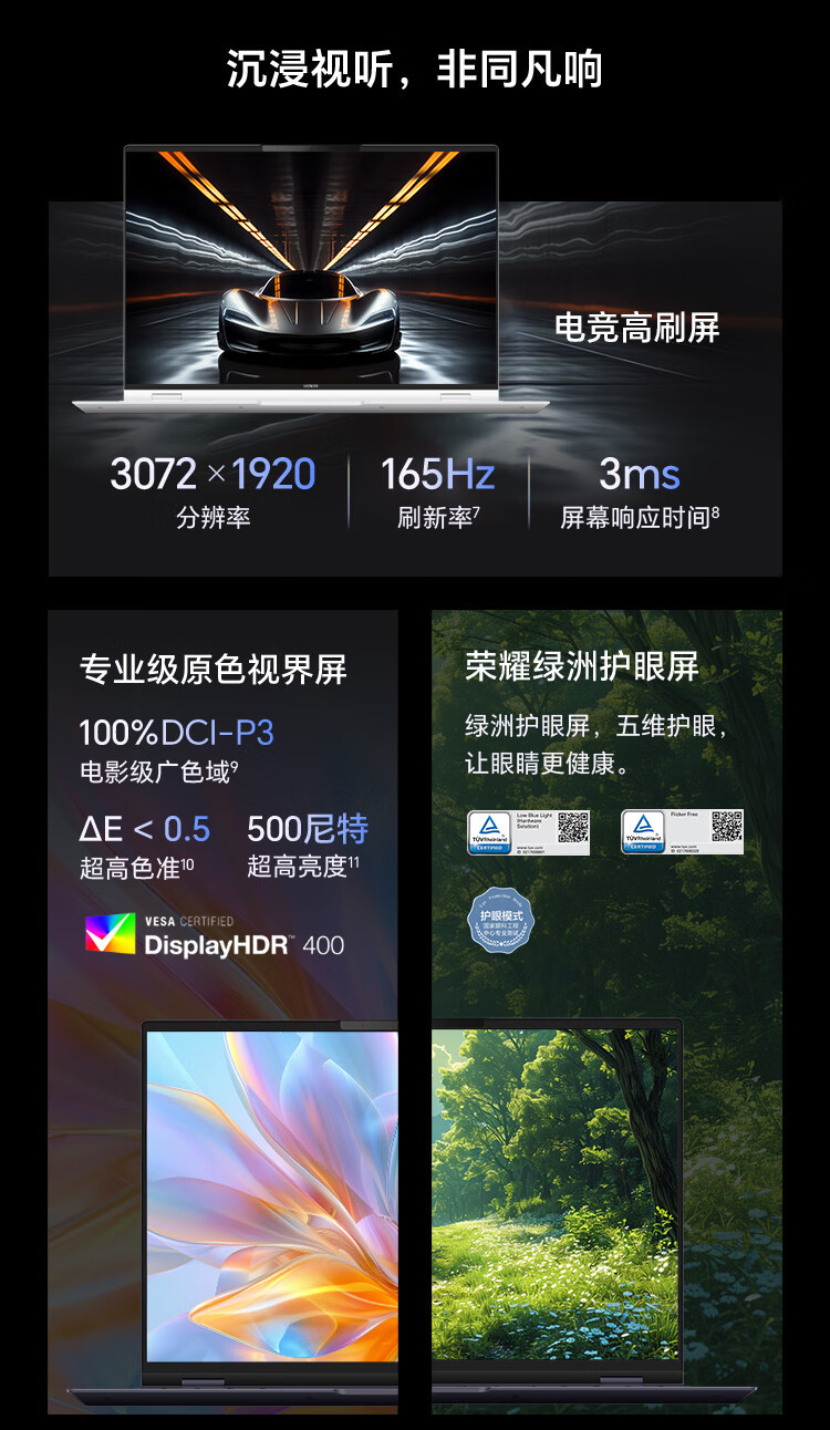 在屏幕方面,这款笔记本配备了一块分辨率为 3072×1920 的 165Hz 屏幕,响应速度达到 3ms ,亮度高达 500 尼特。同时,它还支持 10-Bit 色彩及 100% DCI-P3 色域,为用户带来更加逼真的视觉体验。
