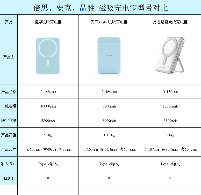 品胜磁吸无线充电宝<安克MagGo磁吸充电宝<倍思磁吸充电宝。想要购买价格便宜一些的,可以选择胜磁吸无线充电宝。而从充电设备、额定容量、尺寸重量、价格等综合条件看,表现较为不错的是品胜磁吸无线充电宝。想要购买性价比高一些的,可以选择品胜磁吸无线充电宝。