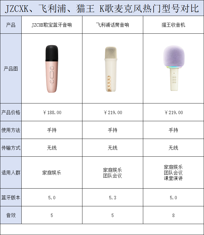 今天小编就给大家测评了三款好用得K歌麦克风产品,它们分别是JZCXK歌宝蓝牙音响、飞利浦话筒音响、猫王收音机,以下是这几款产品的具体参数: