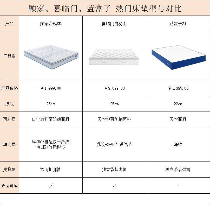 今天小编就给大家盘点了几款销量较高、较好用的床垫产品,它们分别是顾家夺冠SE、喜临门白骑士、蓝盒子Z1.以下是这几款产品的具体参数: