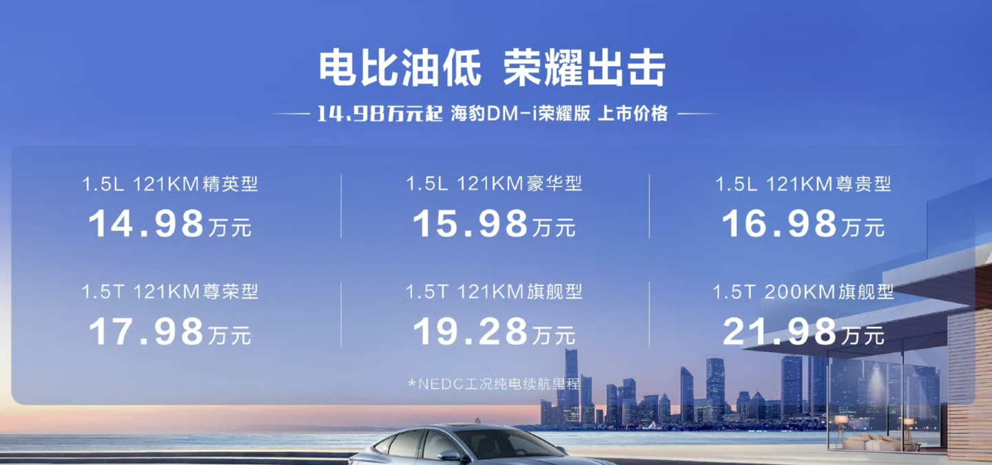 今年 2 月 29 日,比亚迪推出了海豹 DM-i 荣耀版,售价区间为 14.98-21.98 万元。