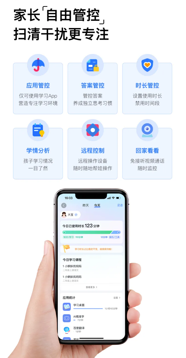 值得一提的是,小度学习机K16内置的家长管控功能可设置4个学习账号,一娃一账号独立学习互不打扰。还提供多维度学情报告,涵盖孩子的学习时长、学习内容、使用应用足迹以及专注力情况等方面,随时随地掌握孩子学习情况,进而更好地引导和支持孩子学习成长。此外在硬件配置上,小度学习机K16搭载8核CPU和6+256GB存储,配合前后三摄辅学智能眼摄像头支持多任务学习,日常使用流畅不卡顿。