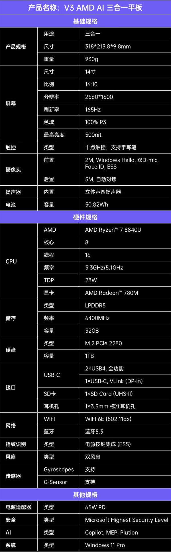 据官方公布的配置信息,性能方面V3三合一平板电脑搭载锐龙7 8840U处理器,基于4nm工艺+Zen4架构打造,具备8核心16线程,睿频可达5.1GHz。集成AI引擎,NUP可达16 TOPS算力,整体可达38TOPS算力,并支持微软实时通信,硬件设计支持微软Copilot。辅以双风扇散热系统,由双风扇+四热管+铝合金鳍片组成,背面进风、顶部出风,可实现28W性能释放,不论是编程开发、游戏玩家,还是平面设计、视频剪辑,皆能满足需求。