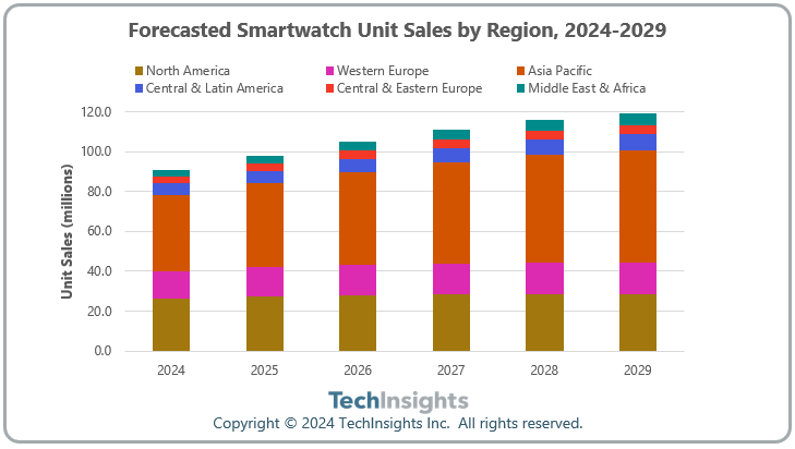 机构预计亚太地区智能手表市场份额将在2029年进一步增加到47%。