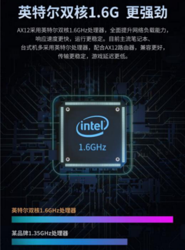 腾达AX12无线路由器采用英特尔双核1.6GHz处理器,全面提升网络负载能力,响应速度更快,运行更稳定。同时目前主流笔记本台式机皆为Intel处理器,配合AX12使用兼容性更好,传输更稳定,延时更低。