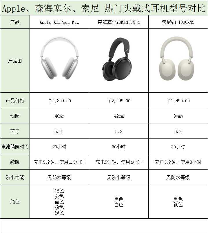 今天小编就来给大家盘点三款高端、时尚的头戴式耳机,它们分别是Apple AirPods Max、森海塞尔MOMENTUM 4、索尼WH-1000XM5.以下是这三款产品的具体参数:
