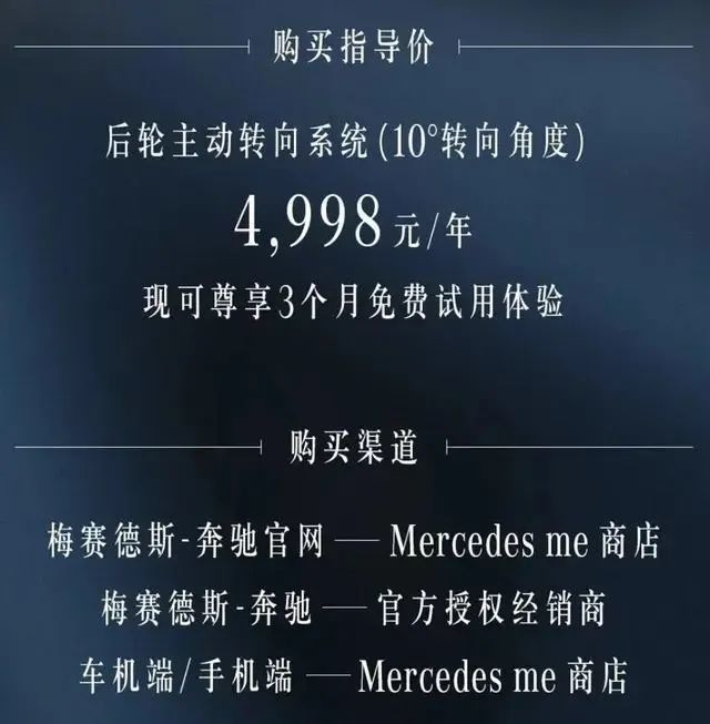 而奔驰自己的后轮转向系统,不仅需要选配,想把可调角度提升到 10 度,还要额外收费,每年要交 4998 元左右。。。看得出来它有多着急回本了。