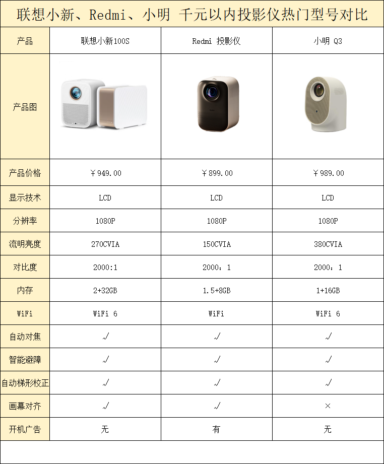 今天小编就给大家带来了几款2023年度较为热门、性价比超高的一千元以内的投影仪产品,它们分别是联想小新100S、Redmi 投影仪、小明 Q3 ,以下是这三款产品的具体参数: