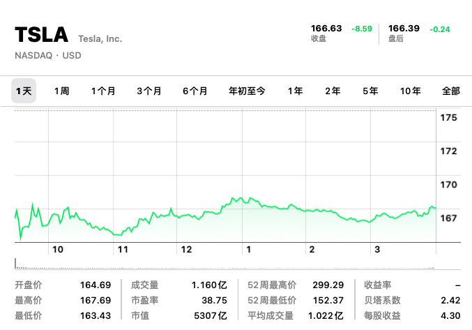 周二美股开盘前,特斯拉股价 下跌7%以上,最终以每股166.63美元收盘,仅一个交易日市值就蒸发了273.6亿美元(约1980亿元)。