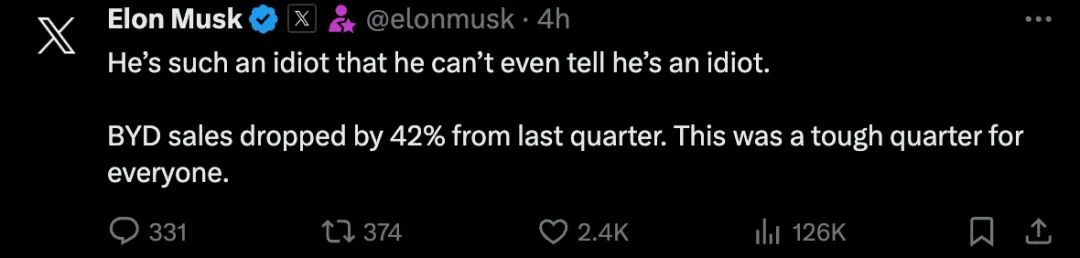 面对天胡开局,马斯克坐不住了,立马回复,他真是个白痴,连自己是个白痴都不知道。因为“比亚迪的销量比上一个季度下降了42%,这个季度对每个人来说都很艰难。”