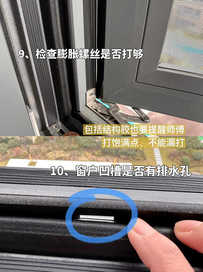 膨胀螺丝不能打在隔热条上,要打在铝框上,结构胶也提醒师傅打饱满点、不能漏打