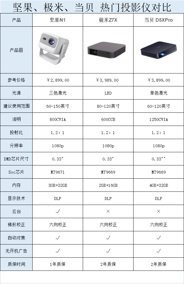 今天小编就给大家带来了几款中高端级别的投影仪产品,这几款投影仪不管是从品牌、配置,还是销量、平价上,都是备受好评,它们分别是当贝X5 Ultra、坚果N1 Ultra、极米RS Pro3.以下是这三款产品的具体参数: