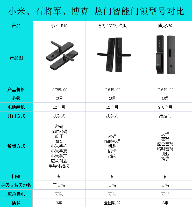 那么我们该怎么选择到适合自家的智能猫眼门锁呢?小编为大家盘点三款好用、热门的智能猫眼门锁产品,它们分别是凯迪仕K70 Pro Max、德施曼K10、鹿客V5Max,以下是这三款产品的具体参数:
