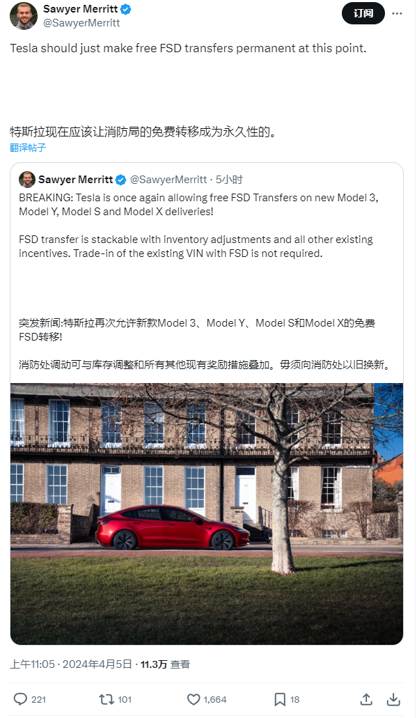 IT之家 4 月 5 日消息,电动汽车分析师索耶・梅里特称,特斯拉现已再次开放 FSD 免费转移功能。他还呼吁特斯拉应该永久提供 FSD 免费转移功能。