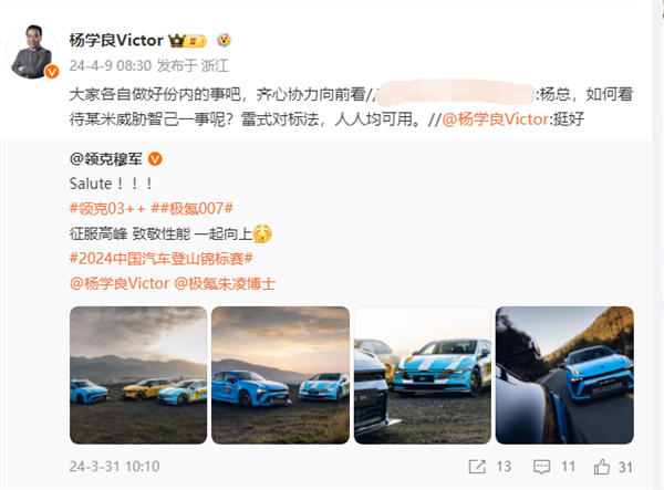 针对此事有网友询问吉利高级副总裁杨学良:“杨总,如何看待某米威胁智己一事呢?雷式对标法,人人均可用。”