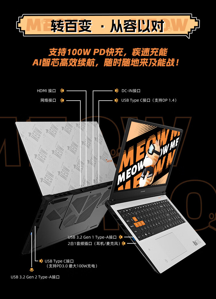值得一提的是,除了预装的固态硬盘外,这款“雪影白”配色的 MEOW R15 游戏本还预留了M.2盘位,用户可以根据自己的需求进行扩展,进一步提升存储性能。接口方面支特100WPD快充、UsB3.2Gen2Type-、USB Type C接口等。